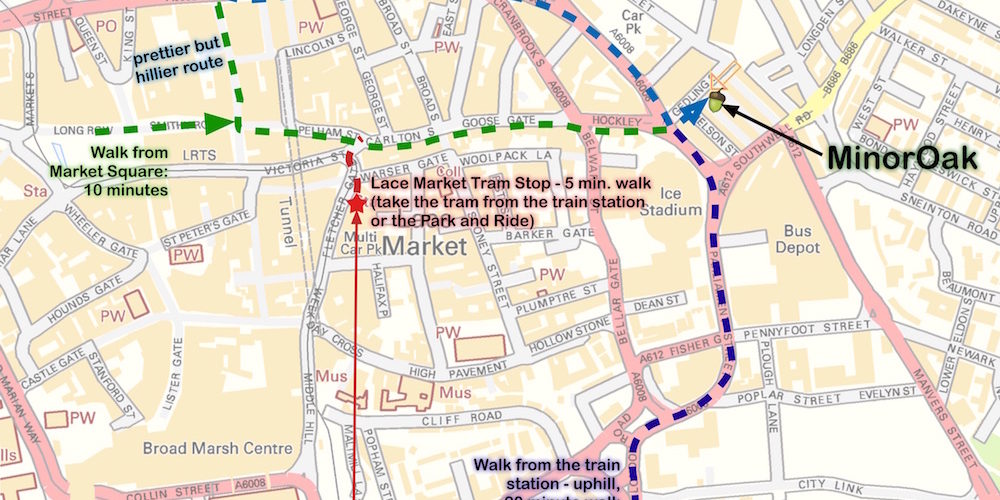 Several MinorOak members take the tram to the Lace Market stop and walk from there; the walk only takes five minutes. On the map above, it’s the red path and then the last part of the green path. If you’re arriving from the train station, then the tram is the quickest, easiest way to get here. The tram is also accessible from the park and ride lots located in Forest Fields, Hucknall, Moor Bridge, the Racecourse, Wilkinson Street, Toton Lane and Clifton. Parking is free, the tram is inexpensive, and you won’t have to deal with city centre traffic or parking.